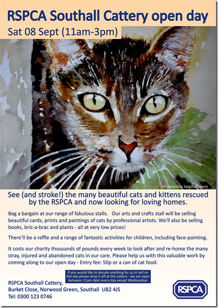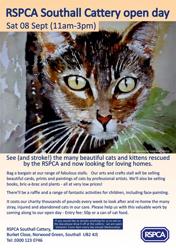 RSPCA’s stray cat centre in Southall look after and re-home hundreds of moggies that have been abandoned every year in London. On 08 Sept they are holding a fair and open day which will include a stall selling feline art, cards, prints and paintings by a number or professional artists. All the money raised from selling the pictures will be used to fund the work of the cattery. There’ll be other stalls and activities for kids too, so why not go along and support their work with cats.