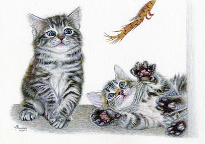 It would have made a very good drawing without background but instead, I went out on a limb and tried to imagine them outdoors, choosing a neutral background that would not take our attention away from the kittens. I went even one step further and changed the ball into a mouse using a field guide for reference pictures of mice.