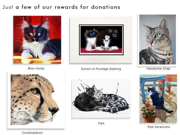 You can simply donate any amount you like without anything in return or you can pick one of the rewards donated by our members and donate the amount associated with the reward. £5 for a pack of cards for example. You’ll receive the reward direct from the artist as a thank you for your donation. Our members have donated some wonderful feline art as rewards, including limited edition prints, cards and paintings.