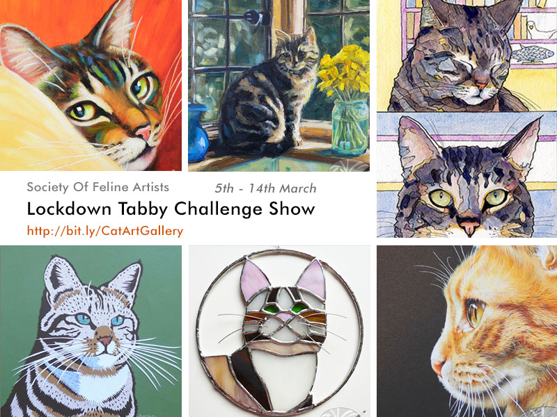 We challenged our members to create a piece of work on the subject of tabby cats, portrait, full figure, up to mischief, indoors or outdoors, whatever they wanted to do. They shared their work in progress in our Studio group on Facebook and we held the show in our online gallery. The show is now over but you can still see the work in progress photo in our Studio Group. The next challenge show will start in April.