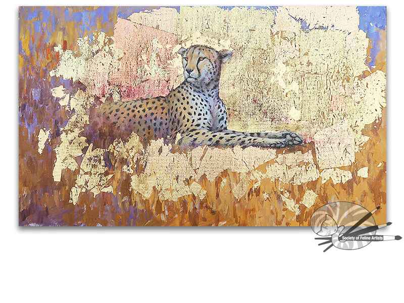 In this stunning mixed media painting, Madeline Downham S.O.F.A. invites us into the private world of a cheetah at rest. Far from the high-speed chase, this magnificent predator is shown in a moment of quiet serenity, her relaxed form conveying a deep sense of calm. The painting’s magic lies in its details, from the exposed paw pads to the luminous background. Here, a masterful mix of pigment and real gold leaf creates a rich, textured setting that celebrates both the raw beauty of the animal and its incredible, quiet power.