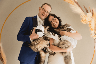 We are a lucky family of four: my husband and I, and our two amazing cats. Toby was adopted from Spain. He wouldn’t hurt a fly, he welcomes you home, and he loves visitors. Then we have our princess, Calypso, who comes from Ukraine. She was rescued from the streets many years ago by a wonderful lady, and she came to the Netherlands with her sister and twenty other rescued cats when the war began.