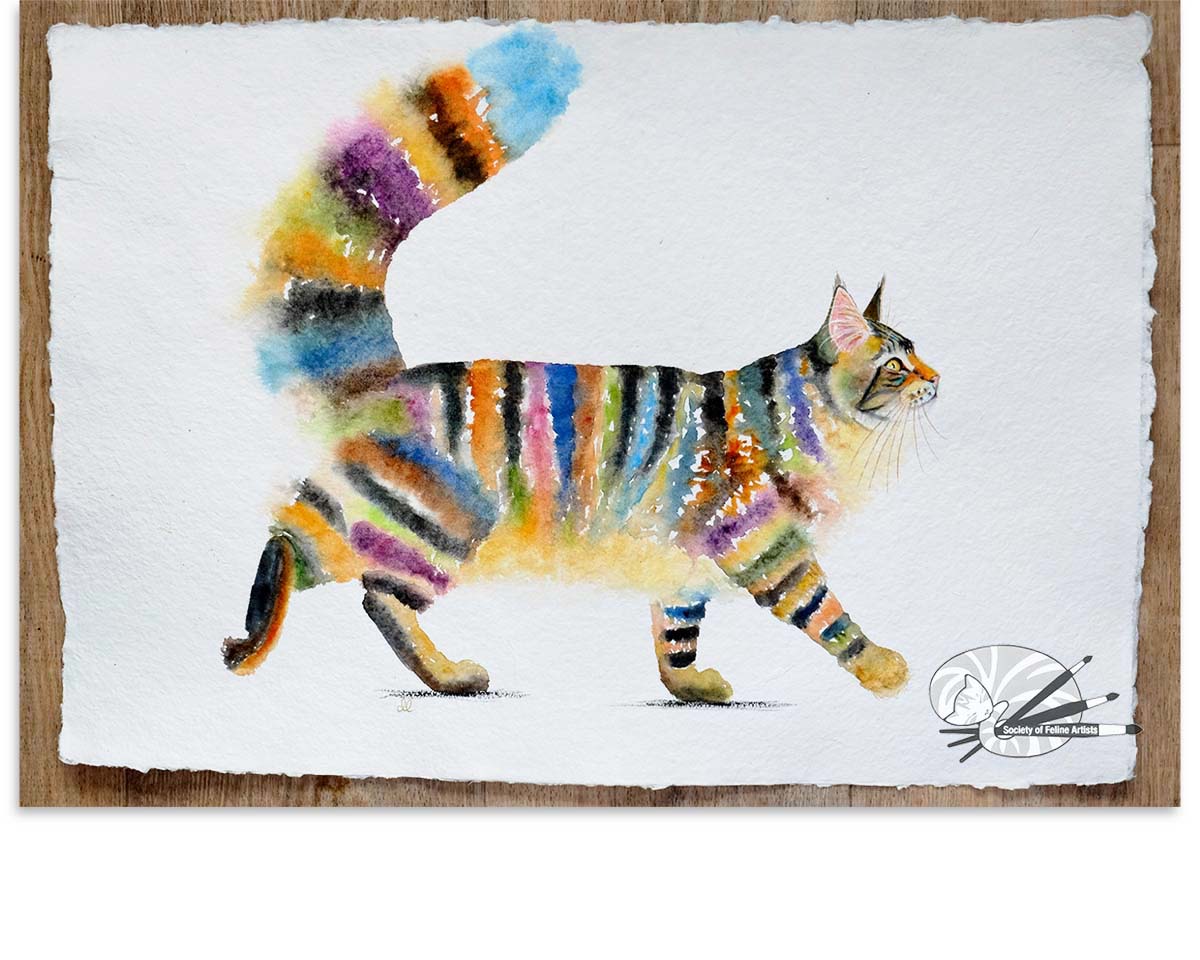 This expressive painting captures the elegance of a long-haired tabby cat as she walks by, tail held high. What makes this piece so special is the artist’s masterful use of the medium and the paper itself: