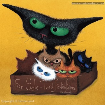 Tamsin Lord is a professionally trained artist whose paintings (which she has affectionately branded ‘The Fiendish Felines‘) are all about fun. Her unique style of art uses narratives to portray those amusing aspects of the lives and loves of our feline friends, and each character that she paints unmistakably displays the spirit and temperament within!