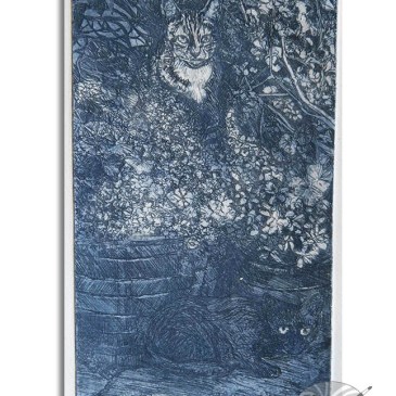 The etchings of Avril Sleeman S.O.F.A. capture more than just a scene, they capture a story. In this delightful piece, two cats, with a shared glint of mischief in their eyes, turn a quiet patio into a playground. Caught in the midst of a spirited game of hide-and-seek, one cat hides in the shadows, while … More Hide And Seek